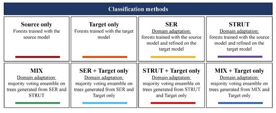 While previously this conclusion was explained in relationship to SVM parameter optimization, in our case the result is obtained using a random forest classifier (with a fixed configuration) and several new transfer learning methods. The domain adaptation methods tested in this study performed as well as the target-only baseline, which did not consider the source information. Similarly to previous findings [], the STRUT algorithm gives better results with respect to the SER when the correspondence between features is maintained, while the SER algorithm outperforms STRUT on inverse problems. From our results, the MIX algorithm obtained a performance that was closer to the best performance, demonstrating that it had not the average performance of the SER and STRUT. SER and STRUT algorithms act differently on the same tree: the SER algorithm changes the size of the original tree, adding depth in the expansion phase and reducing the size of branches in the reduction one; the STRUT algorithm, instead, maintains the original size of the tree, modifying the thresholds. Therefore, the MIX forest turns out to be a more diverse forest, in which the pairwise correlation between two trees, derived from the same original tree, is low.