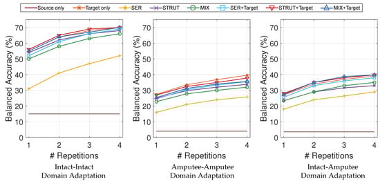 The SER algorithm has a performance that is lower than the STRUT algorithm, while the latter almost perfectly overlaps with the target-only result. Given the low performances of the SER algorithm, it is not surprising that the MIX algorithm does not give the best results. The plots also include the source model tested directly on the target (the flat series of data with the lowest performance in the plot). This result highlights (especially for amputees) how much the high variability between different subjects affects classification performance. Indeed, the classification accuracy is lower when amputee subjects are included, and it is higher when only intact subjects are considered.