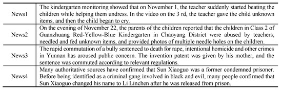 When building the dataset, we follow the following standards: 1. Case-involved events in recent years; 2. Number of public opinions with a certain scale; 3. From official media. We analyzed the hot cases in recent years and selected several high-profile cases to collect data. After that, we manually analyzed the collected news and established the corresponding relationship between the case and the news, and a piece of news was only related to one case. In addition, we also applied some standardized text preprocessing steps, including tokenization [24], special character cleaning and so on. Finally, 12,468 case-involved news items were collected from Chinese microblog Weibo (https://m.weibo.cn/, accessed on 20 October 2021) and official websites of major news media, like Xinhuanet (http://xinhuanet.com/, accessed on 20 October 2021), The People’s Daily (http://paper.people.com.cn/, accessed on 20 October 2021) and so on. The final dataset including five homicide cases, four infringement cases, four fraud cases, one bombing case and one indecent case. The statistics information of our dataset is presented in Table 1.