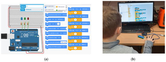 The illustration of students performing programming tasks in electronics courses in different learning modes (a) An example of the task from the second session using the distance form of extracurricular primary school education; (b) An example of the task from the eights session using the traditional form of extracurricular primary school education.