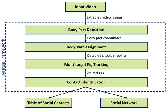 The identification of social interactions is of fundamental importance for animal behavioral studies, addressing numerous problems like investigating the influence of social hierarchical structures or the drivers of agonistic behavioral disorders. However, the majority of previous studies often rely on manual determination of the number and types of social encounters by direct observation which requires a large amount of personnel and economical efforts. To overcome this limitation and increase research efficiency and, thus, contribute to animal welfare in the long term, we propose in this study a framework for the automated identification of social contacts. In this framework, we apply a convolutional neural network (CNN) to detect the location and orientation of pigs within a video and track their movement trajectories over a period of time using a Kalman filter (KF) algorithm. Based on the tracking information, we automatically identify social contacts in the form of head–head and head–tail contacts. Moreover, by using the individual animal IDs, we construct a network of social contacts as the final output. We evaluated the performance of our framework based on two distinct test sets for pig detection and tracking. Consequently, we achieved a Sensitivity, Precision, and F1-score of 94.2%, 95.4%, and 95.1%, respectively, and a score of 94.4%. The findings of this study demonstrate the effectiveness of our keypoint-based tracking-by-detection strategy and can be applied to enhance animal monitoring systems.