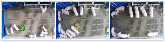 The video data used for this study was collected by [28,29] between October and December 2018 at the research farm Futterkamp of the Chamber of Agriculture of Schleswig-Holstein in Germany during a research project to investigate the effects of different farrowing and rearing systems on the stress level of piglets. For this purpose, a single static camera of the type AXIS M3024-LVE (Axis Communications AB, Lund, Sweden) was assembled 3 m above the ground which recorded all videos with a frame-per-second (fps) rate of 10 frames and a display resolution of 1280 × 800 pixels. For this study, sequences with a varying number of animals and a fixed camera angle have been selected. Figure 2 shows three example frames of structurally identical pens.