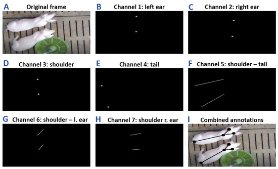 An essential step in the tracking of individual pigs is their successful detection. For this purpose, Psota et al. [23] established a keypoint-based CNN to detect distinct body parts of pigs and highlighted the advantage of this approach over existing bounding box detections. Using this keypoint approach, we implemented a CNN to receive a video frame and to output the coordinates of four individual body parts for each animal. Similar to the work in [23], we stored the coordinate information of the left ear, right ear, shoulder and tail point directly as a binary image in a separate image channel (Figure 3B–E). Additionally, the information for the connection lines shoulder–tail, shoulder–left ear, and the shoulder–right ear are included (Figure 3F–H). In comparison to conventional top-down detection methods, which output bounding box or ellipsoid coordinates, the detected keypoints directly provide a pose representation which facilitates the contact identification of the animals [23].