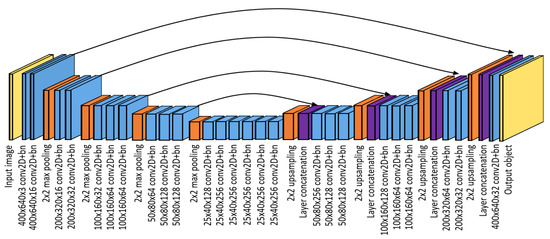 The CNN consists of 25 convolutional layers combined with max pooling and upsampling layers. The first ten layers are used to reduce the input dimension from 640 × 400 pixels to a latent representation of 40 × 25 pixels and extract the main features for the body part detection. At the lowest dimension, six stacked convolutional layers forward the latent image representation to a set of upsampling and convolutional layers, which step-wise increase the image dimension back to 640 × 400 pixels and output the approximate body part coordinates. After each upsampling layer, a residual connection with a concatenation layer is used to copy a representation from the encoder layers to the decoder layers to decrease the reconstruction loss and improve the training efficiency [23,31]. All convolutional layers are implemented with a ReLU activation function, zero padding and a stride parameter of 1. Using the Adam optimizer [32] and binary cross-entropy loss, the network applies a sigmoid activation for the last layer to output pixel intensities between 0 and 1.
