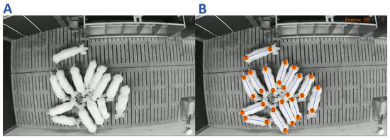 Example of the CNN pig detection showing the original frame (A) and the detected shoulder and tail points (B). The frame shows a feeding situation in which several pigs are in close proximity to each other. Each pig is marked by highlighting the corresponding shoulder and tail points as well as the connection line.