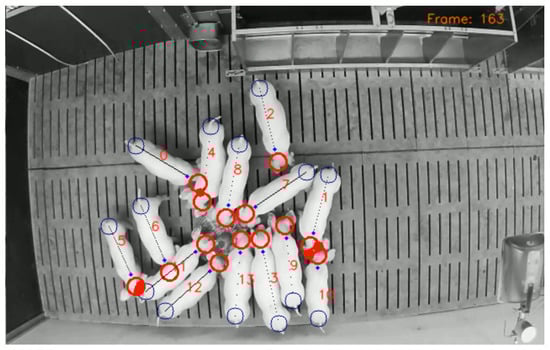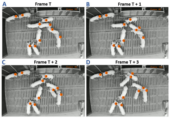After the KF is initialized, it is applied to the ordered shoulder points produced by the CNN. While all videos have been recorded with a fps rate of 10 frames, even intense motion changes of the animals caused just slight pixel variations in the consecutive frames. Therefore, a KF shoulder point in frame k is mapped to the corresponding KF shoulder point in frame by minimizing the Euclidean distance. Consequently, each KF shoulder estimate is assigned an individual animal ID. An example of the pig tracking and ID assignment is shown in Figure 6.