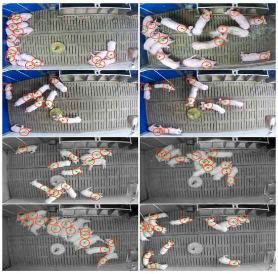 Table 1 shows that the majority of shoulder points was successfully detected by the CNN resulting in high performance values, in terms of Sensitivity, Precision, and F1-Score. While in total 1054 shoulder points have been manually annotated, only a relatively small fraction of these points have not been detected. On the other hand, the number of falsely detected pigs (FP ) indicates that the detection CNN still has limitations in challenging situations like object occlusion. Figure 8 illustrates several example frames from the test set showing cases of successful and failed detections.