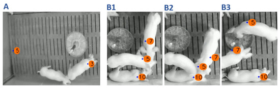Another fundamental issue in the field of multiple object tracking, is the problem of ID switches, which is shown in Figure 9(B1–B3) [21,39,44,54]. In Figure 9(B1), the pigs with IDs 5, 7, and 10 are successfully detected and tracked. During the sequence, pigs 5 and 7 are occluding the shoulder point of pig 10, which leads to a missed detection of this animal by the detector (Figure 9(B2)). However, after all shoulder points reappear in the video, the KF tracker estimates the position of the shoulder points, but swaps IDs 5 and 7 (Figure 9(B3)).