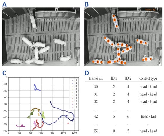 The social contact identification starts with a raw video frame (A). After detecting the shoulder and tail position (B), the trajectories are computed and analyzed over time (C). By identifying cases of close distances, a table of social contacts is constructed automatically (D).