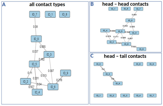The table of social contacts (Figure 10D) contains highly essential information about the contact pattern of animals over all video frames. As Smith et al. [55] pointed out, these data are crucial in the field of behavioral ecology and the automatic contact identification can reduce observer bias as a limiting factor. To address different research questions like the investigation of hierarchical structures, agonistic behavior patterns or pen utilization, the necessary information can be derived from this table as required. Further, this table can be used for extracting a distinct contact period by restricting the frame and ID information. However, the aim of this study is to differentiate between individual contacts. Therefore, the extraction process primarily focuses on the contact type information which is used to visualize the social relationships of the observed animals. Figure 11 shows an example for the visualization depicting both type of contacts (Figure 11A) as well as the specific head–head and head–tail contact types (Figure 11B,C).