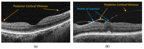 Examples of OCT retina images with posterior vitreous detachment in VMA and VMT. (a) Vitreomacular adhesion (VMA). (b) Vitreomacular traction (VMT).