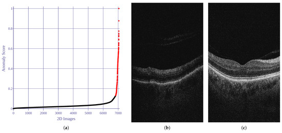 Results of 2D image anomaly detection. Anomaly score is computed as robust covariance value. Black and red dots represent normal and abnormal images, respectively. (a) Anomaly scores for all images. (b) Anomalous example (score = 1). (c) Normal example (score = 0).