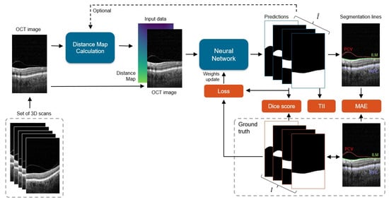 The processing pipeline of the proposed system is presented in Figure 3. Our framework learns correct preretinal space segmentation by separately processing a cohort of 2D OCT cross-sections with their relative distance maps. The predicted probability maps are compared with the ground truth, and the resulting error (loss) is used to update the network weights. The final binary segmentation maps are used to calculate borders between the segmented image regions, namely the PCV, ILM, and RPE lines.