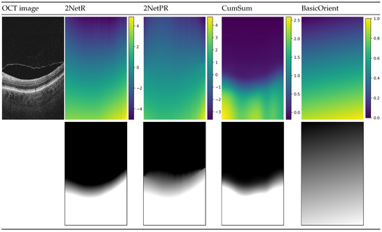 Visualization of used distance maps for an example B-scan: “2NetR”, a map based on previous retina segmentation with a neural network, “2NetPR”, a map based on previous segmentation of retina and preretinal space, “CumSum”, a Cumulative Sum Map, and “BasicOrient”, a Basic Map with Orientation.