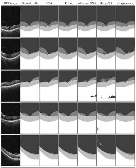 - He, Y.; Carass, A.; Yun, Y.; Zhao, C.; Jedynak, B.M.; Solomon, S.D.; Saidha, S.; Calabresi, P.A.; Prince, J.L. Towards topological correct segmentation of macular OCT from cascaded FCNs. In Fetal, Infant and Ophthalmic Medical Image Analysis; OMIA 2017, FIFI 2017, Lecture Notes in Computer Science, 10554; Springer: Cham, Switzerland, 2017; pp. 202–209. [Google Scholar]