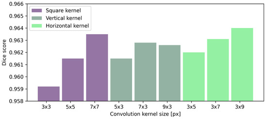 Another way of providing the network with the information of where a given pixel belongs within the image is using a bigger convolution kernel. In contrast to works described in the literature review in Section 2, we propose the use of a non-typical convolutional kernel. It has been reported that by utilizing a vertical convolutional kernel of the size px for ReLayNet [35], the network captures the entire retina in the lowest convolution level. Nevertheless, this approach has not been sufficiently discussed or analyzed in retina layers segmentation to explain the selected kernel size.