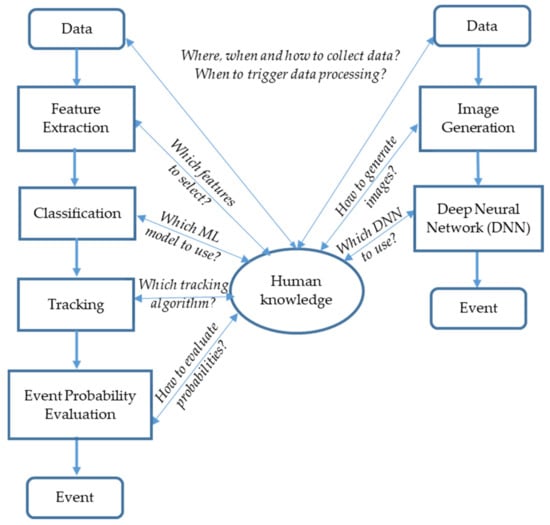 The classical task machine learning approach consists of the following phases: data collection, data preprocessing, feature extraction, feature classification, tracking, and event probability evaluation (see Figure 3, left).