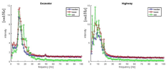 It is important to stress that all signal characteristics are statistically distributed, with relatively large variance, since signal changes depend on the source type and weight, distance, soil type, and temperature, etc. Furthermore, it is important to exploit differences between the excavator spectrum and possible interferers such as land machines, wind wheels, or highways. For example, Figure 7 represents spectrum statistics from an excavator signal, and a highway signal obtained over 100 sample signals for each signal source.