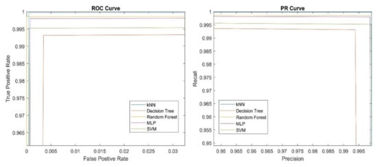 As can be seen from Table 3, all classifiers achieved relatively high (above 99%) and similar performances. It is a well-known fact from ML theory that with enough data, almost all classifiers perform well and are almost equally good [31]. This is also confirmed with ROC and PR curves presented in Figure 8 below.
