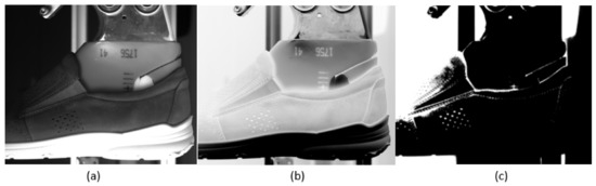 In the field of software, there are few ways of solution possible. The basic solution lays in defining border values. This solution is not adaptable and there is a very high possibility for a wrong decision. Results from this system are very sensitive to input data. Let’s demonstrate it on the input picture shown in Figure 4a. The image was captured with a 12 Mpx camera from Ballufff company (BVS CA-M4112Z00-35-000) with a camera lens, which has a 50 mm focal length (BAM LS-VS-007-C1/1-5018-C). There was a linear monochromatic red light of wavelength 617 nm (BAE LX-VS-LR200-S26) implemented from a distance of 200 mm. It was placed on the left side of the shoe. This implementation produced shadows occurring mainly on the border of the shoe upper. Figure 4b was performed as inverted (Aopp) to the original image (Aorg) according to (1) as coded picture by 8 bits, where 0 represents black color and 255 represents white color. This way possibly created an inverted picture, where the black color changes to white and vice versa. The main reason for this procedure was to highlight borders, which were displayed as dark pixels. For this reason, the image shown in Figure 4b is used in further work described in this paper. Figure 4c illustrates dark places from the original image by the usage of the threshold algorithm defined in (2) from Figure 4b. The result is an expression of the most lighted places in the picture, which means edges created by the lighting condition during capturing the image and geometry of the captured object.