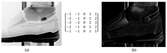 It is solvable by edge detection, where the detected edge of the shoe defines its position over the last. Figure 5b illustrates the result of a filter application on the original image shown in Figure 5a. The mentioned filter in Figure 5 was implemented as a matrix of size 5 × 5. Filtering was performed by OpenCV library, working on the convolution principle [18]. This type of filter suppresses the horizontal edge defining the border between the upper and the last. More types of matrices different in both type and size were tested. Results were in general very similar, not enabling us to decide positively about the application of this method. Dispersion in the edges is very wide and it is not possible to define important edges clearly.