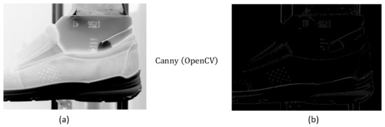 A perspective method of edge detection is to use the Canny algorithm [19,20]. This method includes more mathematical operations. For simplification, the Canny algorithm from OpenCV in python language [21] displayed in Figure 6 was used. If comparing Figure 6 to Figure 5, the Canny algorithm suppresses the main features occurring on the shoe. On the other hand, this algorithm much better highlights edges than simple edge detection by the matrix.
