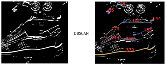 The other solution may be considering the implementation of a clustering algorithm on the edges detected in the captured picture. Due to the shape of the edges, the appropriate method is DBSCAN clustering [22,23,24]. To use this method, it was necessary to generate an image with wider detected edges than in previous examples. It was performed by the filter described in (3), that represents the same values in every row, where the first row contains values-15 and the last row contains values 14. The mentioned filter highlights the edges of horizontal character and suppresses other types of edges. The disadvantage is the edges being thick, making this method less accurate. Based on these data it is possible to define the positions of the edges as illustrated in Figure 7. There are highlights in the nine biggest recognized clusters. They are visualized in color, including annotations according to a specific number cluster. This clustering is necessary for the specification of highlighted pixels to the specific detected edge and for identification of required edge characterized border between the shoe upper and the shoe last. Other possible software methods include segmentation etc. Any suitable method from a wide range of available methods and approaches described in scientific papers and in the industry may be used. The method described in this paper using camera vision is suitable for inspection of the position of the upper over the last. Disadvantages are in complication by using blurs, edge detection, and clustering method. Other main disadvantages are inaccuracy and sensitivity of capturing the images by camera vision. The approximate resolution of images captured by camera vision is expressed in (4). Basically, it is the resolution defined in captured images as the specific length visualized (D) by correspondent numbers of pixels () and decrease resolution by the number of pixels () from the matrix used for edge detection.