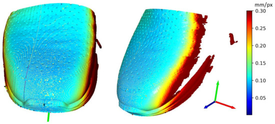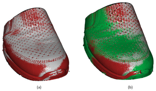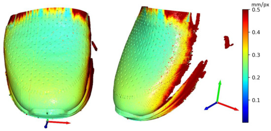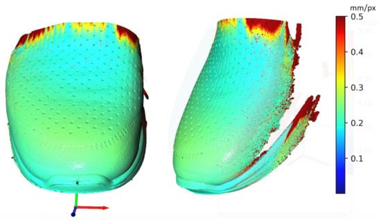 In This paper, there are two methodologies of performing inspection issues for the shoe industry described. In the first case, it was the method of capturing 12 Mpx images by camera vision. These data were used to evaluate the position of the upper on the last. Evaluating was performed by processing image, edge detection, and final DBSCAN clustering, separating white pixels to edges. To sum up, there is the possibility to inspect an object’s position as geometric characterization by camera vision. In case of the requirement of higher precision than 1 mm, it is complicated due to basic resolution characterized as the captured length in the corresponding number of captured pixels in (4). Resolution this way of the mentioned camera device is approximately 0.1 mm. In combination with a large size matrix filter, defined in (3), resolution decreases to approximately 3 mm with high uncertainty. Using camera vision in the shoe inspection system is appropriate in visual surface inspection [34]. On a geometric surface, shoe inspection is feasible but unreliable. The second mentioned method using laser sensors is more satisfying in resolution, device requirements, and reliability. Resolutions are described by (5) for X-axis and (7) for Y-axis, which are according to the scanned shape surface approximately from 0.2 to 0.5 mm per point (mm/px). This correspondence to real obtained resolution according to the type of sensing device-sensors and scanned surface and their common positions. The best reachable resolutions in ideal conditions were expressed as = 0.012 mm in scanning distance 226.4 mm, = 0.0735 mm and = 0.2 mm and final resolution R = 0.2134 mm. Evaluation of the resolution based on (5) is displayed in Figure 16. The resolution in the Y-axis (7) is displayed in Figure 17. Evaluation is shown on Scan 20, which represents file 2020_09_21__00_0__2__0__1__11.csv. For this shoe type we performed 67 experimental scans which have been evaluated to simulate any wrong placement positions. For the resolution in the Y-axis the parameters of scanning are important, where the scan frequency was set to 100 Hz and line velocity of linear motion was 20 mm/s. The main core is computed as polynomials of 6th degree by polynomial regression as from a specific part of point cloud defined by shoe scan. Based on the resolution on the X-axis and on the Y-axis the resolution of point cloud can be computed, which is displayed in Figure 18, where the results are expressed as the square root of the sum of the squares of the individual resolutions. Evaluation resolution values are displayed in Figure 19. There are also higher values occurring than is displayed in mentioned images. These values are mainly in point poor areas in the point cloud and in hard-scannable areas, which generate quite different values from the main values in the range from 0.001 to 0.5 mm per point. The higher values were threshold to the maximal displayed value.