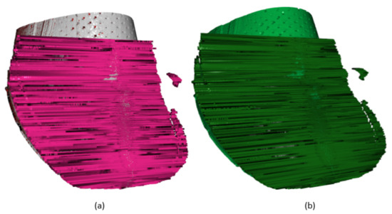 In Figure 11, there are scans of correct placement of the upper over the last displayed. These data are the reference for the generation of etalon data (Figure 11b). Data are in form of a point cloud [31,32]. For the generation of etalon data, it is necessary to sort the data to evaluate positions and to define the appropriate position of points in the space. This is done mainly by generating the algorithm for sorting points based on (6), summarizing them, and computing the median in the specific position in (8), where “k” represents the number of scans used to generate the etalon data. Variable “n” represents the numbers of from scans for computing the mean value of etalon data .