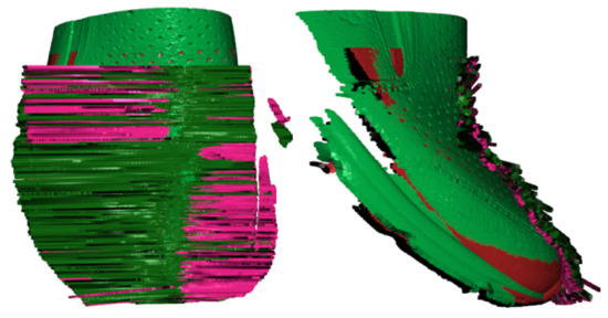 Summarizing the above-performed work is in Figure 14, where it is displayed combining the etalon scan with tangents in green color and inspected scan by visual red and black color and correspondent tangents. The left side of Figure 14 demonstrates the rotation-YR in a specific way, where one part is significantly rotated in one direction. The right side of Figure 14 demonstrates the dominating of the green color of etalon scan and inspected scan in red color is under the green surface.