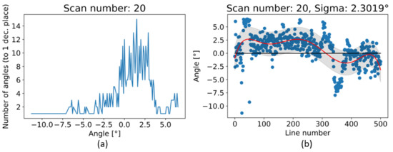 Angles between the tangents for scan number: 20, (a) number of angles rounded to one decimal place and (b) angles approximated to polynomial of 7th degree with standard deviation.