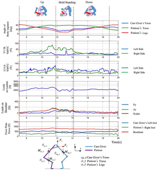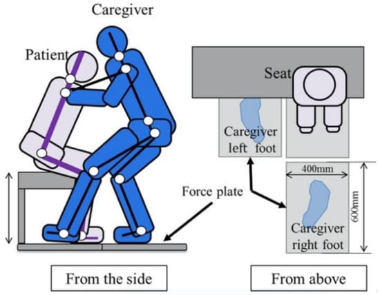 - Yamazaki, N.; Yamamoto, S.; Inoue, T. Measurement of transferring motions and evaluation of caregiver’s lower-back load. Biomechanisms 2002, 16, 195–205. [Google Scholar] [CrossRef][Green Version]