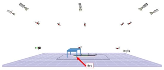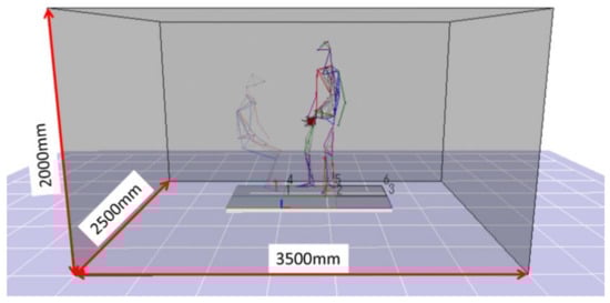 In the experiment of this study, all the motion measurement experiments were carried out in the motion measurement room of the Institute of Gerontology (IOG) in the Kashiwa Campus of the University of Tokyo. The measurement conditions are 50 Hz. As shown in Figure 4, the movement measurement area of the room is 3500 mm wide, 250 mm deep, and 2000 mm high, which is enough to evaluate the transfer movement and preparatory research movement as the protagonist in this study. In addition, by synchronizing with the floor reaction force meter, the position and vector of the force on the floor reaction force can be measured according to the force and moment vector working on the floor reaction force. The camera configuration during the experiment is shown in Figure 5.