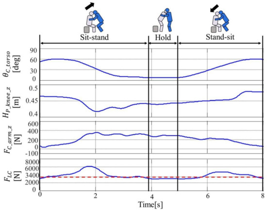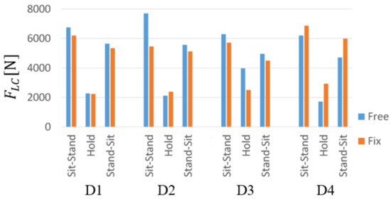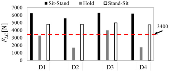 Figure 7 shows the maximum value of for each subject’s motion section. exceeded 3400 N in Sit-Stand and Stand-Sit in all subjects, and was around 3400 N in Hold. In addition, when the values for each section are compared, is maximized in Sit-Stand.