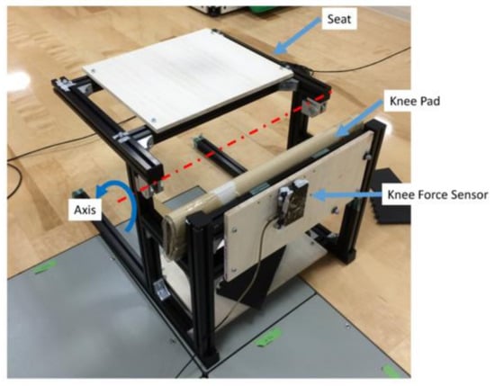 We used Misumi aluminum frame to make a mock-up (Figure 8) that can fix the knee joint of the elderly and lift the seat surface. This mock-up is also loaded with a pedal dynamometer (force sensor) of Kyowa Electronic Instruments Co., Ltd. (Chofu City, Japan) with a rated capacity of 500 N. It can measure the reaction force generated by the contact between the caregiver’s knee joint and the mock-up, and the experiment can be carried out in synchronization with the three-dimensional motion analysis device.