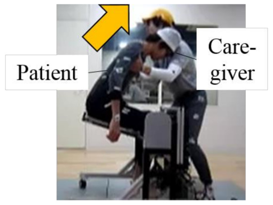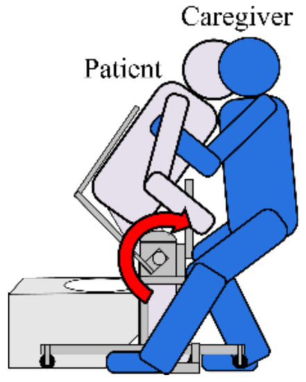 Looking at the caregivers in welfare facilities for the elderly, the disaster rate of low back pain is very high. It is reported that 80% of caregivers have a history of low back pain at work and many back pain problems have been reported as issues that need to be solved in order to improve the working environment of caregivers [3,4]. Caregivers carry out heavy work such as lifting the care recipients (the elderly) repeatedly, there are many bending postures and twisting movements, and it is difficult to obtain spontaneous rest, which will also aggravate the mental burden [5]. According to a report by the Ministry of Health, Labour and Welfare (MHLW), 70% of the causes of lower back pain among caregivers are movements (from wheelchair to bed, from wheelchair to toilet, etc.) that support the elderly in transfer [6]. Therefore, it is an important factor in improving the working environment of caregivers [7].