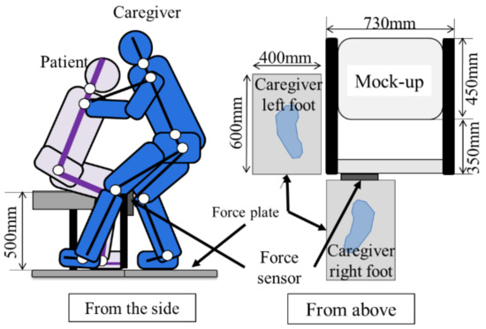 The subjects, experimental procedure and experimental devices used are the same as those in Section 2.3.1, and the mock-up in Section 2.4.1 is added, performed with the positional relationship shown in Figure 10. For the movement, the caregiver performed a Sit-Stand assistive movement using the front holding method to the elderly, and the state was measured.