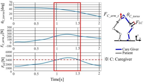 The operation was from the time when the caregiver started to raise the trunk to the time when the erecting was performed, and the average of the operating time was 2.76 ± 0.30 s. Figure 11 shown the time series responses of the caregiver’s trunk tilt angle , upper limb exertion force , lumbar disc compression force during the Sit-Stand of a representative subject D1 (height: 1.72 m, weight: 71.0 kg). As for Sit-Stand movement, decreases with time. There was a tendency for to increase when increased. In addition, at the time surrounded by red squares, the evaluation standard value of 3400 N was exceeded, indicating that Sit-Stand movement is with a high risk of back pain.