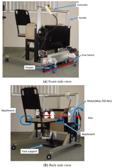 - Wu, J.; Shino, M. Development of Transfer Assist Equipment by Lower Back Burden Reduction Method of Caregiver. In Proceedings of the 2018 IEEE International Conference on Robotics and Biomimetics (ROBIO), Kuala Lumpur, Malaysia, 12–15 December 2018; pp. 691–696. [Google Scholar]