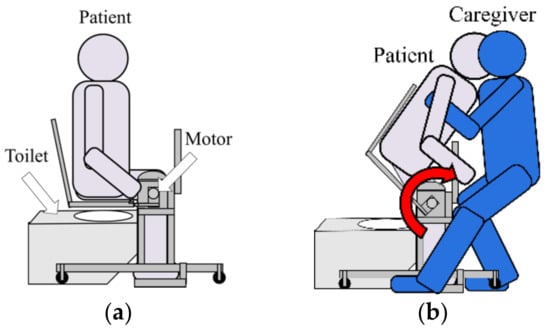 Focusing on the transfer movement to the toilet, we investigated transfer assistive devices that can assist lifting the hip out of the seat. It is roughly divided into caregiver assistive type and care recipient assistive type. The caregiver assistive type is a method of wearing an exoskeleton robot suit or a strap type muscle strength assistance suit on the caregiver [10,11,12,13]. The methods for the buttocks to leave the seat in the care recipient assistive type include a device for leaning forward with the upper limbs or upper body to make the buttocks leave the seat, and an auxiliary lift for assisting the elderly to stand under the condition of fixing the knee through the armrest on the armpit and back [14,15,16,17,18,19].