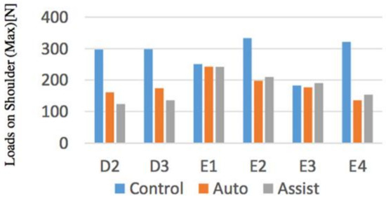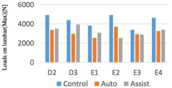 The maximum value of the lumbar disc compression force between the subjects and the maximum value of the force applied to the upper limbs were evaluated. As objective results, from Figure 19 and Figure 20, by using the device in the movement other than D3, it was found that the loads on the waist returns to the safety standard. When comparing the forces applied to the upper limbs, the force decreased in operations other than E1 and E3. The reason why the change in the force applied to the upper limb in the operation of E1, E3 was small being that the loads on the Control Condition is small, so that it is thought that the simulated elderly E2, E4 in each operation were not sufficiently weak at the Control Condition.