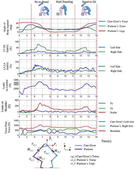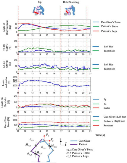 However, is the caregiver’s upper limb exertion force, is the moment arm (vector from the waist joint to the grip), is the weight of the caregiver’s head and upper torso, is the length of the body, including the upper torso and head of the caregiver, and is the leaning angle of the caregiver. Since the transfer operation is a relatively slow operation, we exclude the dynamic term. In this Equation (2), the terms that change during the movement are the trunk tilt angle of the caregiver , the upper limb exertion power of the caregiver , and the moment arm . Therefore, these three variables were set as lumbar burden factors.
