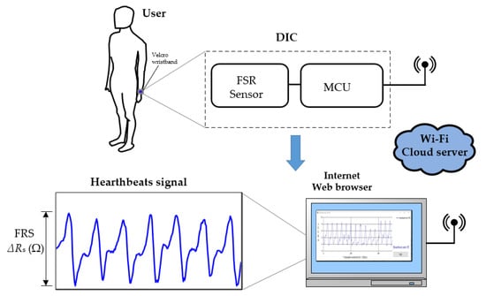 FSR is a flexible, very low-cost, and robust polymer thick film (PTF) sensor whose resistance (Rs) changes with an increase in the force applied to the sensor’s surface. Heartbeats can be detected by attaching the sensor to the skin in places near the big arteries, which expand their area each time the heart expels blood to the body [23]. Figure 1 depicts the proposed system for sensing the heartbeats of a subject; the FSR is placed near the radial artery with a Velcro wristband and changes its electrical resistance (∆Rs) every time a pulse is detected. Hence, if DIC is able to measure such small-resistance variations caused by cardiac activity, the HR of a subject can be measured. Moreover, the heartbeat’s signal could be transmitted via Wi-Fi to a secured cloud server where any Wi-Fi device could access the report server with proper credential authentication.