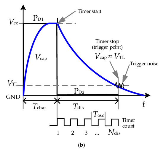 Ideally, the time-to-digital conversion has a resolution equal to Tosc. However, the main uncertainty sources are the quantization of the timer and the trigger noise (the point when Vcap ≈ VTL and the timer stops is a noise-sensitive process) [24]. If only quantization effects are considered, the resolution of the DIC in bits, M, or ohms, r, respectively, is: