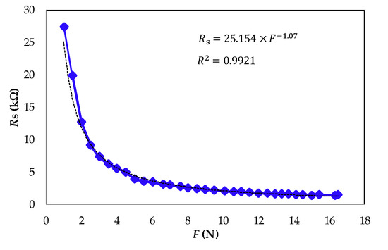 The DIC (Figure 2a) was implemented by a D1 mini ESP32 module. This module was designed for mobile electronics and Internet-of-Things (IoT) applications. It has an MCU (ESP32 from Espressif Systems) that contains Wi-Fi and Bluetooth (BLE embedded) and 520 kB of RAM. The module was powered by a rechargeable battery 5 V at 1 A and 2.2 Ah, and the MCU with Vcc = 3.3 V by a voltage regulator incorporated in the module. Rs was an FSR-402 sensor (from Interlink Electronics) with a sensible area of 14.68 mm in diameter, a nominal thickness of 0.46 mm, Rs > 10 MΩ without force applied, and rise time of <3 µs. To know the sensor response, known forces from 1 N to 16.5 N were applied (Figure 3). In addition, the nominal Rs value was measured with a digital multimeter when the FSR was placed in a Velcro wristband near the radial artery, the nominal value was Rs = Rs,0 ≈ 5 kΩ.