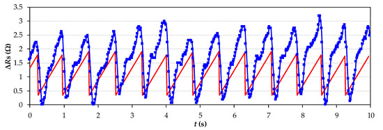The MCU program to measure Tdis (and so Rs) by following the sequence described in Section 2.2 was implemented in C language. PD1 and PD2 (Figure 2a) were implemented by GPIOs 13 and 14, respectively. (The MCU works at 80 MHz, so the digital timer measures Tdis with a resolution of Tosc = 12.5 ns.) From each measurement of Tdis, Rs was obtained from (1). The MCU parameters Vcc = 3.23 V, VTL = 1.56 V, RO1 = 32 Ω were obtained from the procedures described in [18]. By considering ∆Rs,max = Rs,max − Rs,min ≈ 200 Ω and M = 10 bits, from (5), the minimal value of C is 86 nF, a metallized polypropylene with C = 150 nF was chosen. According to [25], a DIC with these values would be capable of a maximum sampling rate of 1.75 kSa/s, more than enough for this application.