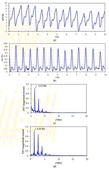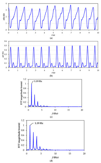 Figure 6c,d show the frequency spectrum of the heartbeat signal for S1; in both figures, there was a fundamental peak at 1.31 Hz (79 BPM). In the same way, Figure 7c,d show the frequency spectrum of the heartbeat signals for S2; in both cases, there was a fundamental peak at 1.19 Hz (72 BPM). These results demonstrate that the proposed wearable system is able to detect cardiac activity beat by beat, and it is also able to detect different heart rates. Furthermore, the FSR signals have a negligible contribution of noise, which facilitates the estimation of HR.