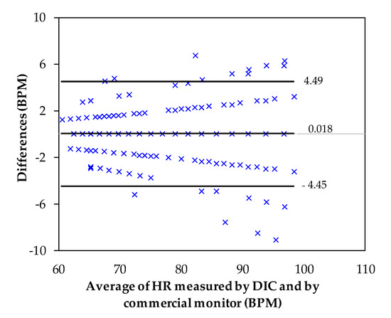 We used the Bland–Altman plot to examine the agreement between the proposed wearable system and commercial heart rate monitor. Ten records of heartbeat signals were taken from each volunteer. As proposed in [26,27], the Limit of Agreement (LoA) was obtained with a 95 % confidence interval as [µ − 1.96σ, µ + 1.96σ], where µ is the average difference, and σ is the standard deviation. Pearson’s correlation between the two measurement systems was also estimated.