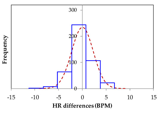 The Bland–Altman plot that compares the heartbeat signals (peak to peak) measured from the five volunteers (500 records) by the DIC and by the commercial monitor is shown in Figure 8. The average difference, the standard deviation, and LoA were, respectively: µ = 0.018, σ = 2.28, and [−4.45, 4.49] all in BPM. The histogram in Figure 9 shows a normal distribution of the peak-to-peak differences from the HR measured by DIC and by commercial monitor. As observed in the Bland–Altman plot, from 60 BPM to approximately 96 BPM there is a high agreement between the two measurement systems. The scatter plot between the HR measured by the DIC and by commercial monitor is given in Figure 10. The Pearson coefficient was 0.9817, which is a statistically significant correlation. Therefore, it is shown that there is an excellent coincidence between the signals obtained with the DIC and the commercial system.