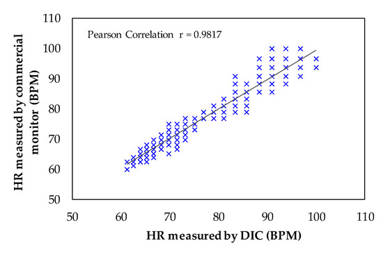 Scatter plot of the peak-to-peak HR measured by the DIC and by the commercial monitor.